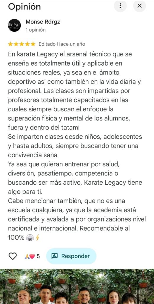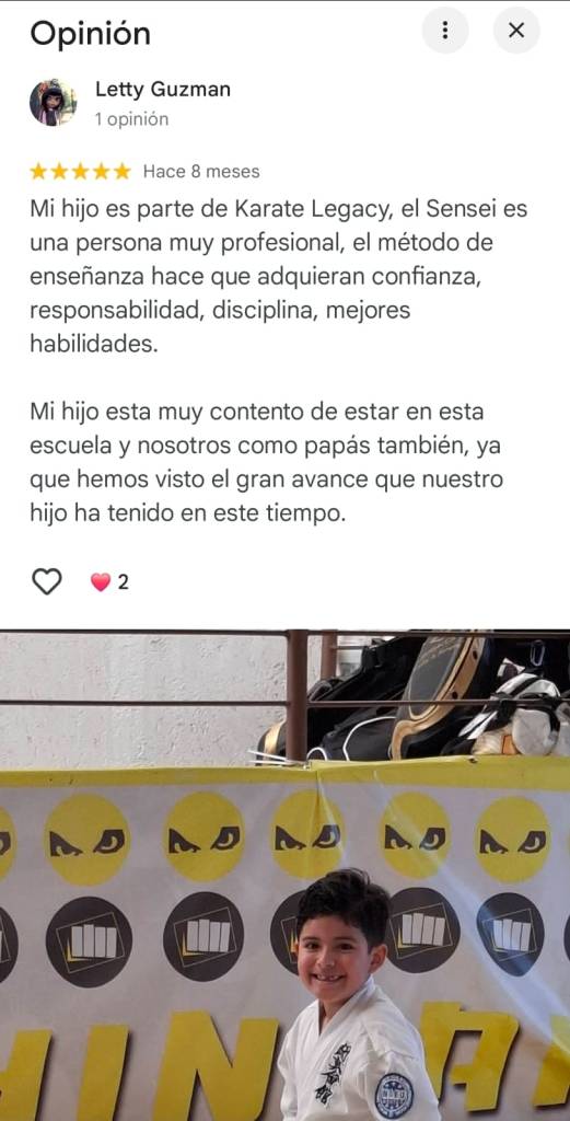 Mi hijo es parte de Karate Legacy, el Sensei es una persona muy profesional, el método de enseñanza hace que adquieran confianza, responsabilidad, disciplina, mejores habilidades.